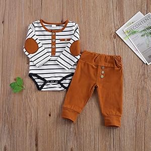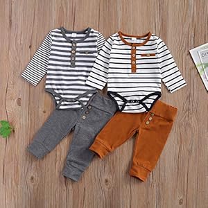 2Pcs/Set Newborn Baby Boys Outfit Long Sleeve Striped Bodysuit Romper Solid Pants Fall Winter Clothes (Khaki, 0-3 Months)