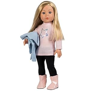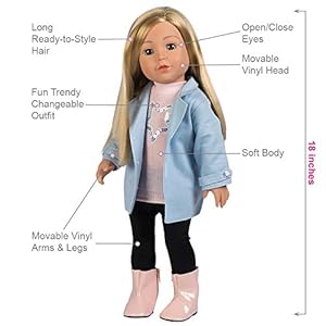 A best friend for every child! ADORAble 18 INCH DOLL with open/close sweet blue eyes & long blonde hair, wearing a light pink long-sleeved shirt with a sparkly sequin star, a blue chic twill peacoat with buttons, black leggings & pink boots