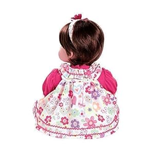 This ADORAble realistic baby doll is here to spread love, joy, and happiness to everyone she meets! Adora ToddlerTime Doll Love & Joy is looking absolutely sweet in her lovely ensemble of soft cotton 2-piece bright flower printed romper with poofy fuchsia-colored sleeves, ruffled bodice detailing and big bow accent on the front—this type of cutie! So lifelike, this baby doll is eager to play with you with her bright brown eyes framed by her silky brown hair adorned with a coordinating scrunchy hair accent! Her matching bloomers matches perfectly with her fuchsia and white, soft sateen slip-on shoes. What’s fun is that this lifelike doll also comes wearing a traditional diaper for a more realistic play with your little ones—consider the fun in the playroom!