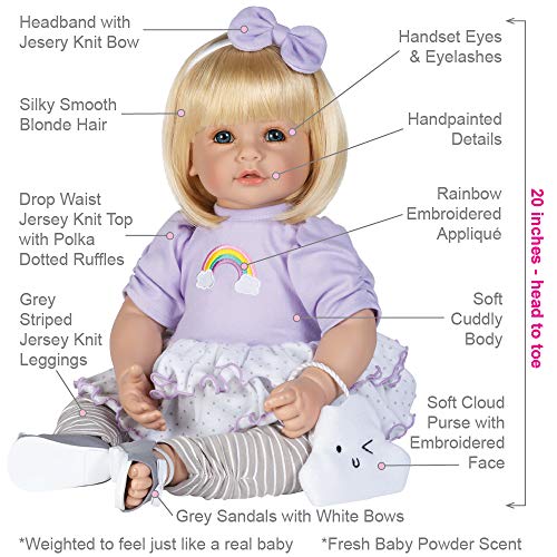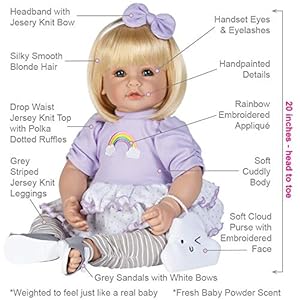 Get ready to be on cloud nine! ToddlerTime Doll Over The Rainbow is a cuddle-ready cutie & happy as can also be! This realistic doll is all dressed to play with your little one with her lavender jersey drop waist top with 2 layers of white polka dot ruffles and an ADORAble embroidered rainbow applique on the front. This blonde cutie also wears grey & white stripped leggings, a pair of grey sandals with cute white bows, and a matching white headband with a lavender bow to complete her premium fashion ensemble! Underneath is a traditional diaper for a more realistic fun play. Oh, and the most efficient part? This lifelike doll comes with a soft cloud purse with an embroidered face, perfect for carrying things at the same time as on-the-go!