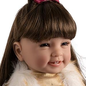 Adora ToddlerTime Doll Starry Night has a styleable long dark brown hair with a matching maroon bow headband, a pair of bright brown eyes, and an ADORAble face with a sweet toothy smile expression! Best is, she comes with a diaper! This baby doll has a soft cuddly cloth body and ¾ vinyl limbs crafted from our baby powder scented CuddleMe™ vinyl which makes this play doll gentle and feels more like a real baby! This realistic baby doll is Made for Play and encourages nurturing, pretend play. Ages 6 and up.