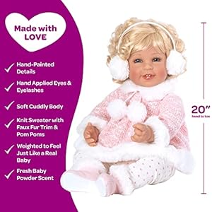 Stepping out from her Winter Wonderland, this cozy bundle of wintertime beauty brings an impossible to resist charm to your play time! ToddlerTime Doll Winter Wonder’s delightful smile & precious cheeks are framed by her bouncy blonde ringlets that may be styled in many ways. This realistic baby doll is snuggled up in her cozy winter ensemble of ADORAble knit pink dress accented with fluffy faux fur trim and pom-pom details, soft to touch heart print leggings, and completed by a pair of matching faux suede boots for an ultimate stylish winter stroll with her winter play pal ToddlerTime Winter Dream in Adora baby doll stroller! Don’t fail to remember this baby doll’s detachable fluffy earmuffs to give protection to her delicate ears from the cold when you are taking her outdoor!