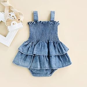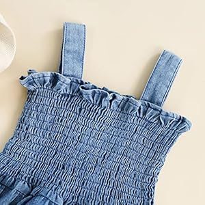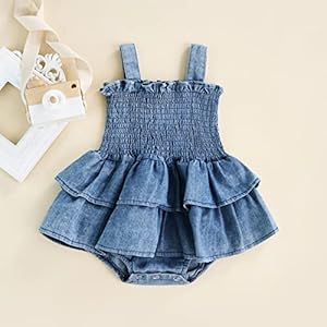 Baby Girl Denim Rompers Sleeveless Suspender Pleated Ruffle Hem Bottom Snap Jumpsuits Dress Clothes (Blue, 6-12 Months)