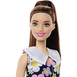 Barbie doll has a smaller bust and wears a daisy print shift dress featuring an oversized collar. Pink boots finish the playful yet modern look.