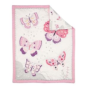 This three-piece baby bedding set includes one quilt, one fitted crib Sheet, and one crib skirt. The cover features beautiful butterflies in sun shades of pinks, lavender, and purple. There’s a 2-inch pink border and a pretty silver ric rac trim which decorates the interior border. The fitted crib Sheet is on a crisp white ground and is full of colorful butterflies, stars, and clouds. Complete this charming baby bedding collection with the Pink crib skirt with pink, purple and white butterflies, and stars. This collection has been printed in a high resolution for enhanced colors and is made of a soft microfiber. This set is a most sensible baby registry select and makes an excellent baby shower gift.