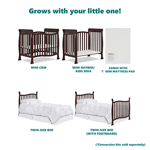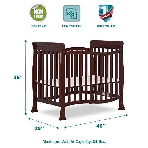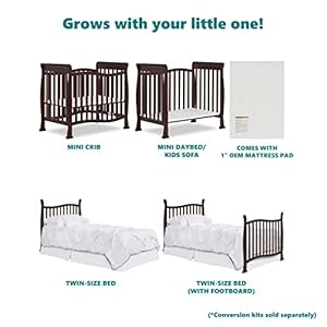 The Violet 4-in-1 Convertible Mini Crib is the very best nursery solution for small spaces and to keep pace with the changing needs of your growing child. Starting as a mini crib, You’ll convert it into a mini daybed and twin-size bed (bed rails sold one after the other).Built of solid pinewood, the Violet attracts with a flowing and curvy design. Minimalist with a small footprint, it’s ideal to take advantage of small spaces or if you end up co-sharing with your baby. You’ll Choose between pleasant non-toxic, water based paint finishes and create a stylish space for your child.The Violet has a 3-position adjustable mattress height setting that You’ll adjust as your child grows. It comes with the regulatory 1” mattress pad. Select a Dream On Me non-toxic, Greenguard Gold certified mini or portable crib mattress for an ideal fit. At Dream On Me we prioritize safety. All our cribs are JPMA certified and are tested for lead and other toxic elements to meet/exceed government and ASTM safety standards. Product dimensions are 40L x 25W x 36H inches. Maximum weight limit is 50 lbs. All tools/assembly instructions included.