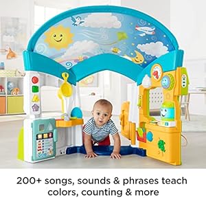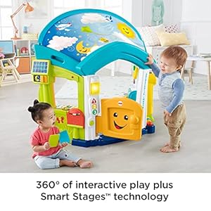 Welcome home, kiddo! With a number of hands-on play and “high-tech” activities all around, this interactive playhouse helps your baby learn about numbers, shapes, the weather, and more, with rewarding music, lights, and sounds as they explore. And, as little homeowners grow, they may be able to engage in super fun role play, pretending to “work” in the office or whip up something delicious in the kitchen! Where development comes into play Academics: Playful songs and phrases introduce numbers & counting, shapes & colors, weather, opposites, and more. Gross Motor: With interactive activities in and around the house, your kiddo may not wish to miss a thing. They are going to be crawling, standing, and walking all around to explore! Creativity & Imagination: The realistic design and play features encourage early role play and imaginative fun as your little one pretends to make this playhouse their home!