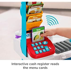 125+ songs, sounds & phrases! “Magical” cash register reads all 4 menu cards. Press the number buttons to “ring up” orders, and push the music button for a playlist of learning songs