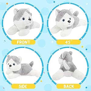 A CUTE HUSKY: This cuddly husky stuffed animal has a vivid image. It features a quiet crouching dog. Quite a lot of people are living with dogs, however, to those who loves dog but are allergic to the fur or kids who are too little to hug a four-leg friend with paws and fangs, this glow soft plush husky may be a good alternative.
