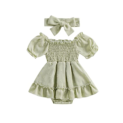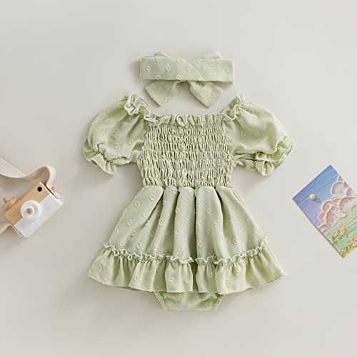 DESIGN: Newborn baby girl romper Get dressed use dot pattern, elastic boat-neck, short sleeve, ruched, ruffle hem, skirts hem design, bottom snap closure for simple changing diaper, matches with bow headband, chic and stylish.