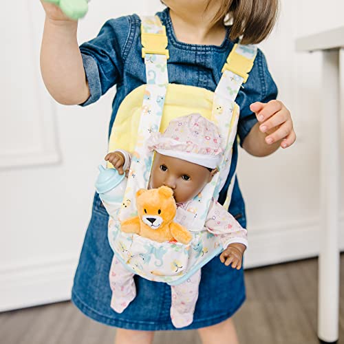 When little caregivers wish to be hands-free, there’s nothing better than this realistic baby carrier for kids’ favorite dolls and stuffed animals! The adjustable carrier holds dolls as much as 18 inches and will also be worn in the front or back, with “baby” facing forward or backward. The play set includes a toy stuffed bear, baby bottle, butterfly rattle, and a reusable double-sided activity card, all of which tuck conveniently into two pockets in the carrier. Sturdy construction and machine washable. With Mine to Love toys, kids three and older can explore grown-up roles and responsibilities at the same time as having endless fun taking care of their babies. (Dolls/stuffed animals–other than the small toy bear–not included with this set.) For more than 30 years, Melissa & Doug has created beautifully designed imagination- and creativity-sparking products that NBC News referred to as “the gold standard in early childhood play.” Lately, Melissa & Doug is proudly partnering with the American Academy of Pediatrics to foster early brain development and assist children build vital life skills through play.