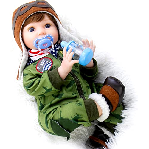 Milidool Reborn Baby Dolls, Realistic Newborn Baby Boy Doll, 22 inch Lifelike Handsome Pilot Boy Doll with Feeding Toy Set, Great Gift for Grandma and Kids 3+