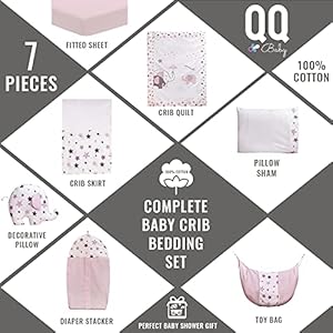 👶 9-PIECES COMPLETE SET: QQ Baby nursery bedding set includes a quilt/comforter, a 4-sided crib skirt with a sheet, 2 extra fitted sheets, a pillow sham, a decorative pillow, elephant toy, a toy bag and a diaper bag.