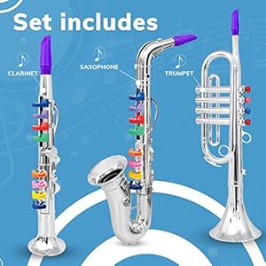Set of 3 Kids Musical Instruments Toy Clarinet, Toy Saxophone and Toy Trumpet, 3 Wind and Brass Musical Instruments Combo with Over 10 Color Keys Coded Teaching Songs for Toddlers