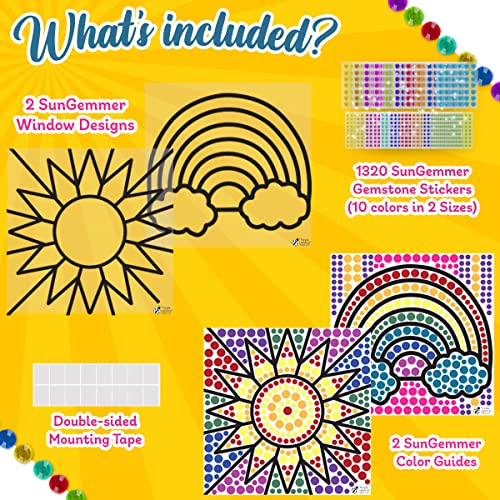 Complete craft kit to create your own unique sparkly window art very quickly! Includes 2 pre-printed window designs, 2 color guides, over 1000 SunGemmer gemstone suncatching stickers, a double sided mounting tape, plus full instructions.