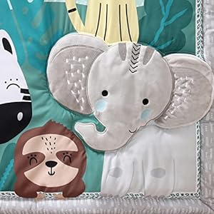 Our colorful, multi-functional crib quilt features an elephant, lion, monkey, and more enchanting safari animals hanging out amid leafy scenery in quite a lot of shades of blue and green that allows for a multitude of uses out and in your baby’s nursery. It’s also reversible with the alternative side matching the dust ruffle design