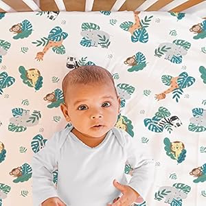 The fitted crib sheet has the easiest universal fit, designed for the standard 28” x 52” crib mattress with snug fitting all around elastic with an allover pattern of bright, colorful jungle animals and leaf clusters
