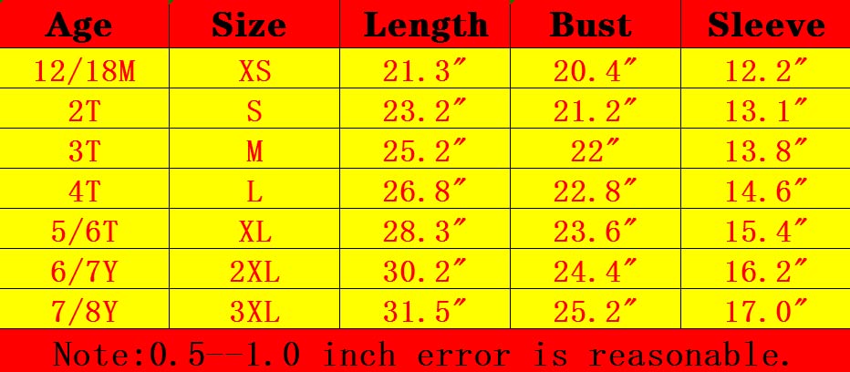 Size Chart : M(3T),L(4T); XL(5/6T); 2XL(6/7T);3XL(7/8T)