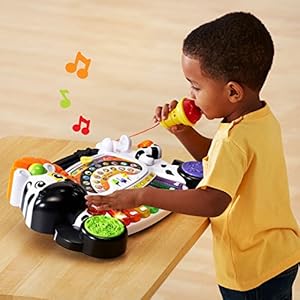 A microphone lets kids sing along and hear their own amplified voice; features 100+ songs, melodies, sounds and phrases