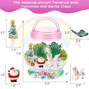 Unicorn Terrarium Kit: Kit accommodates easy with care for on lid, LED string lights, unicorn model, Santa Claus model, pebbles, clear crystal (large, small) little sword grass, Christmas tree, Christmas gift box, butterfly model, Mushrooms, moss.