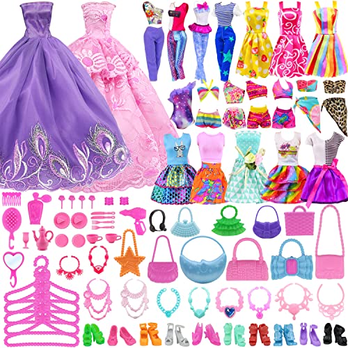 Super value pack includes: 1 doll closet/wardrobe, 1 suitcase, 2 casual clothes set, 2 swimsuits, 2 long party dress gowns, 3 mini dresses, 10 necklaces, 10 shoes, 10 bags, 10 hangers and 50 accessories for 11.5 inch girl dolls. (DOLL IS NOT INCLUDED. Fixed style closet, shoes rack, suitcase and hangers. Random style clothes,shoes and other accessories.)
